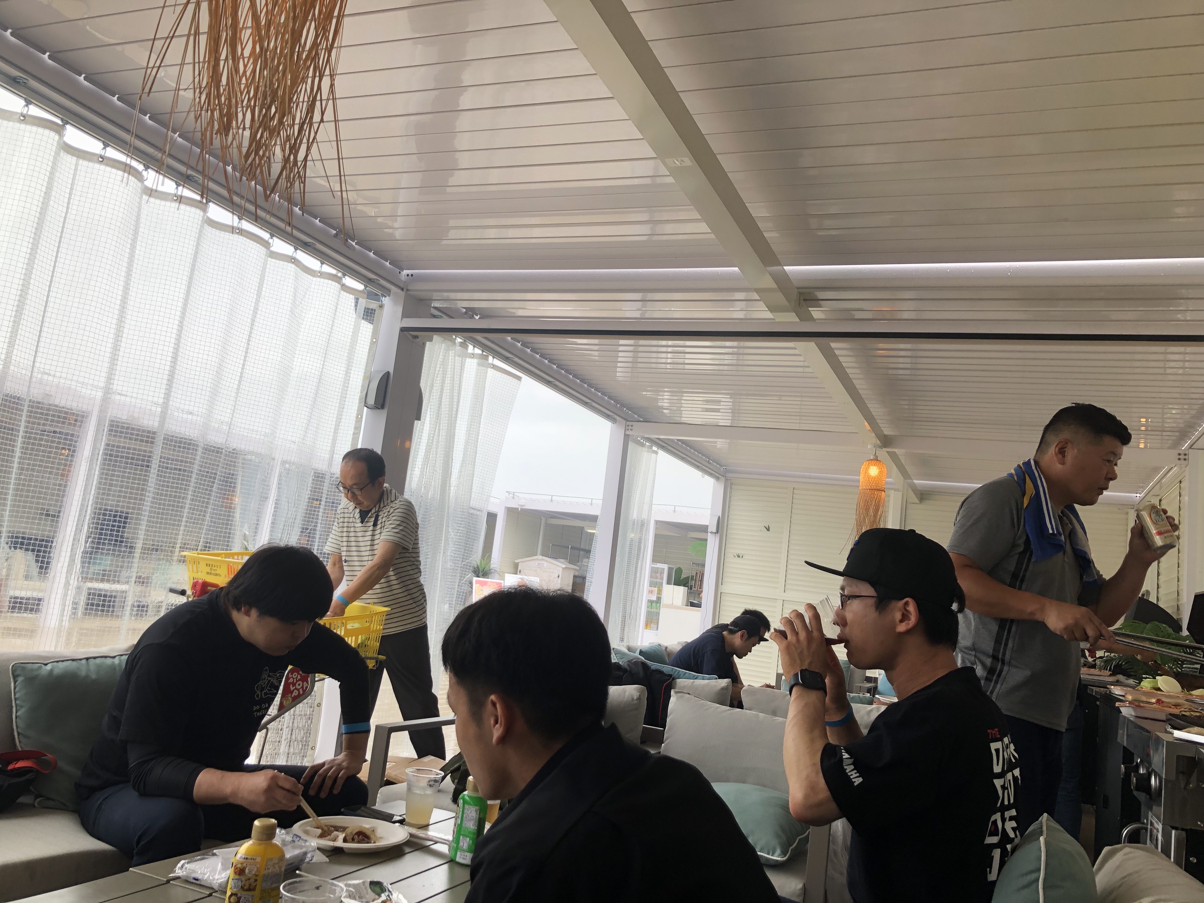 当日は雨が降っていましたが、屋根付きで雨除けにもなるロールカーテンが付いていたのでBBQ中は濡れることはありませんでした。