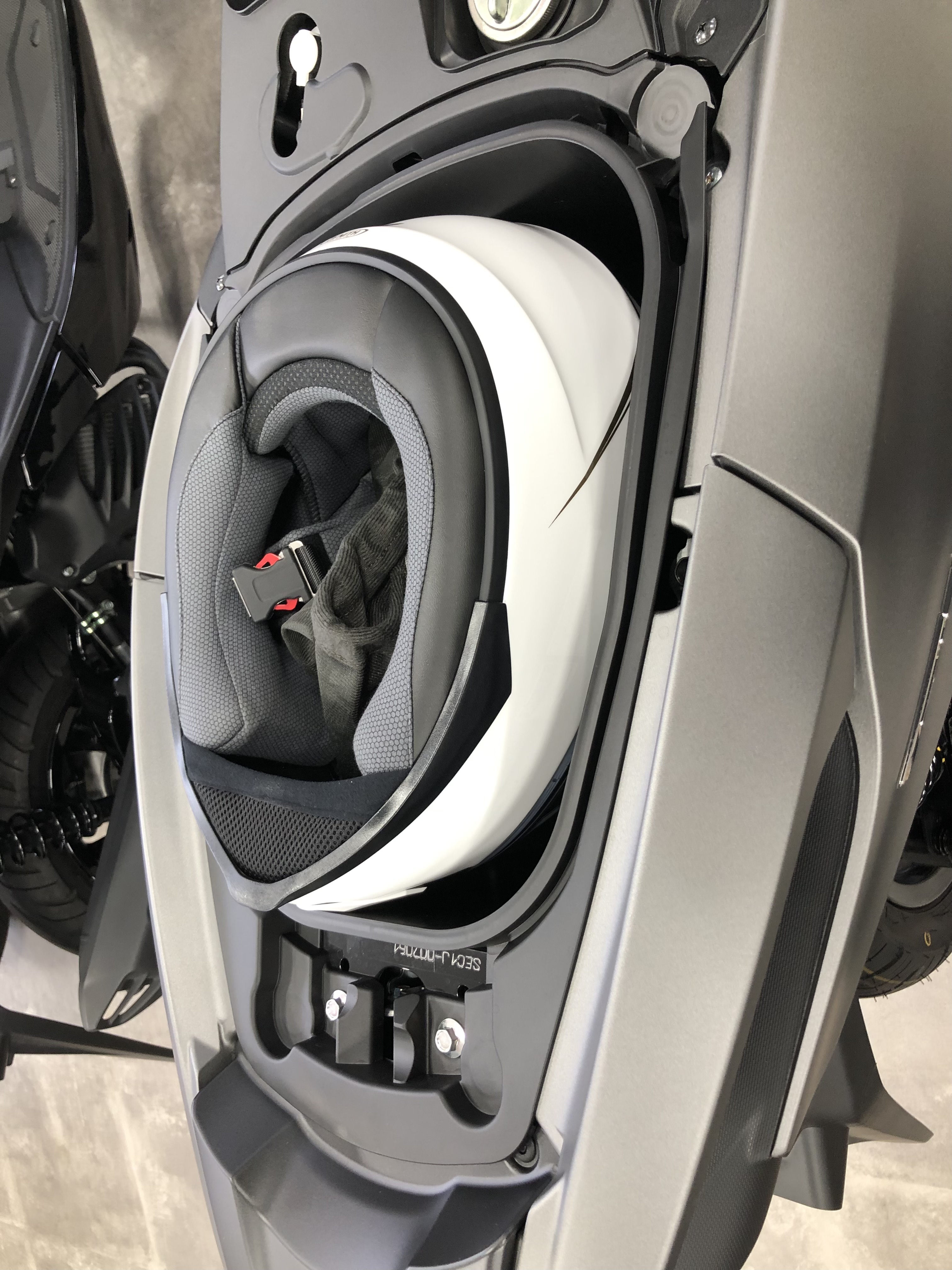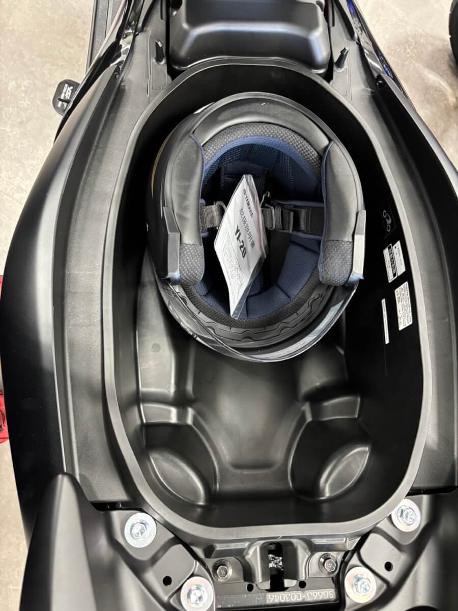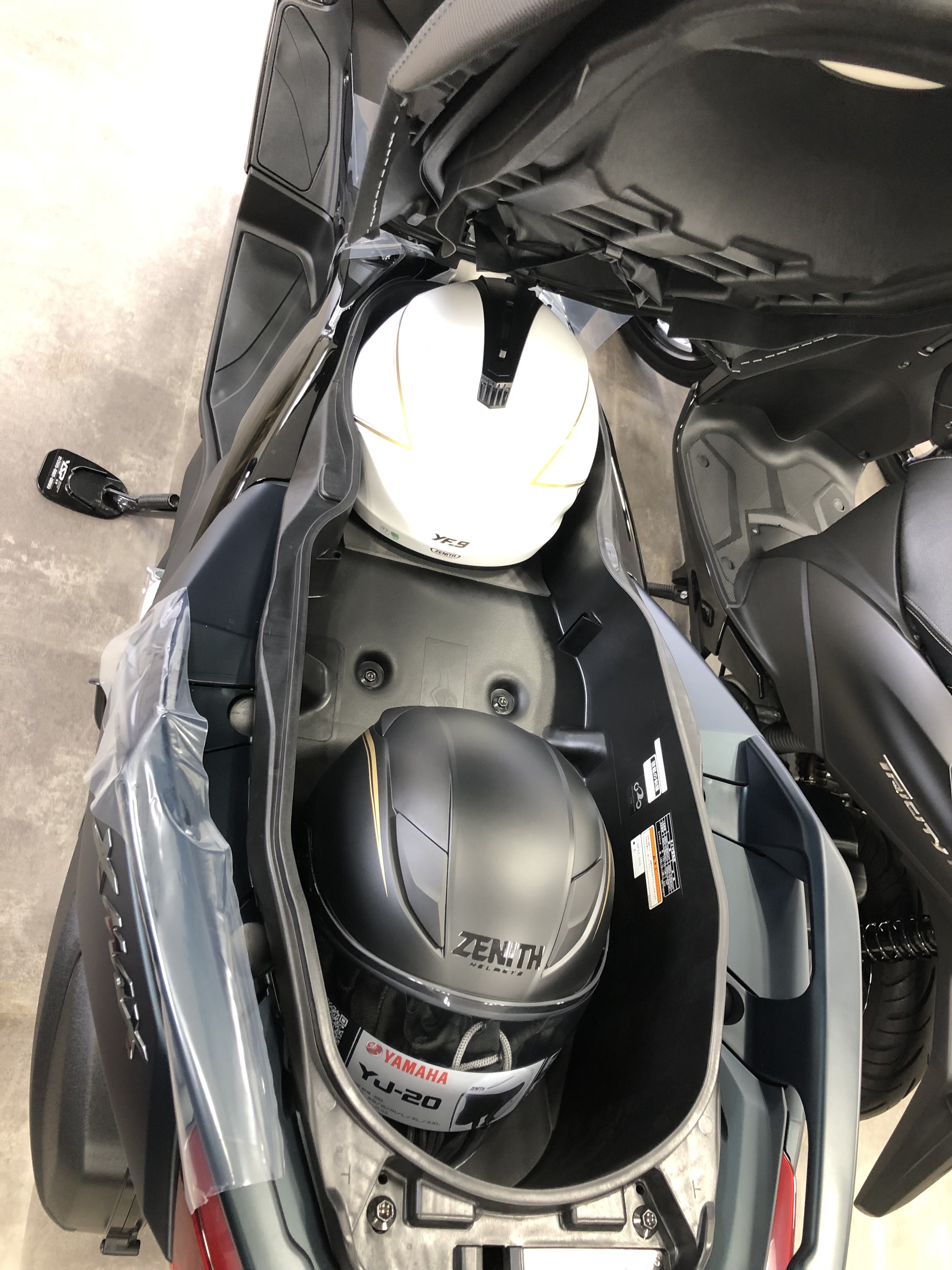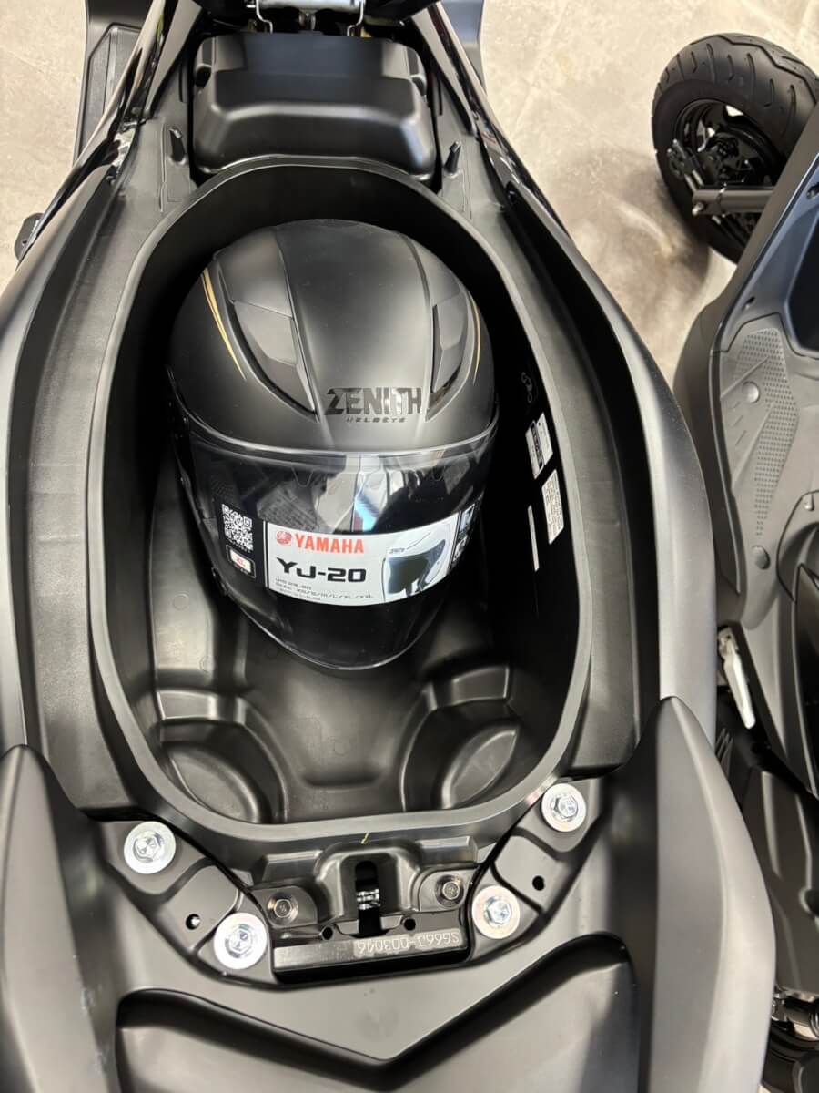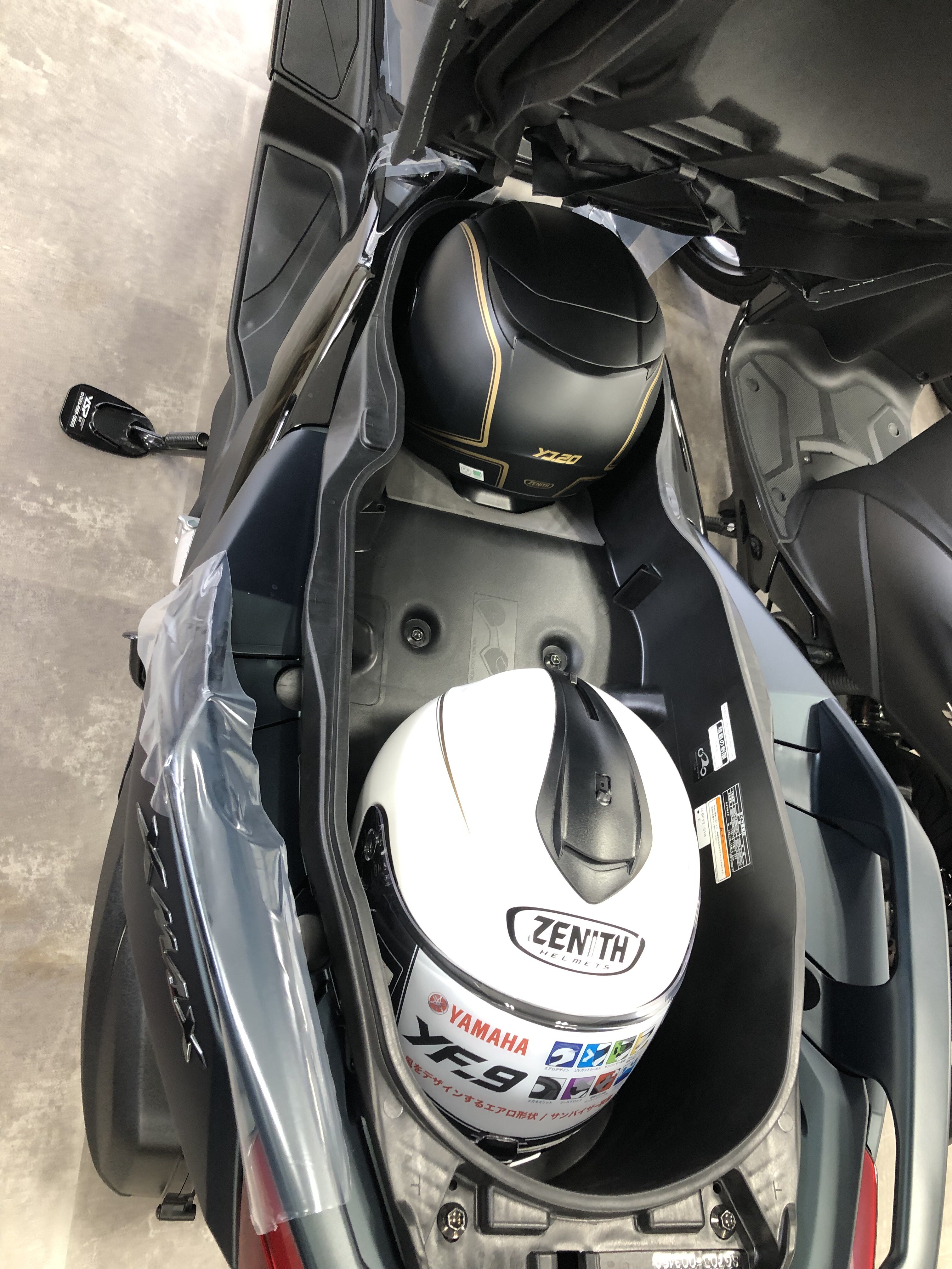 XMAXはシート下、中央部にヘルメットを入れる方向を示す絵がありますよ。