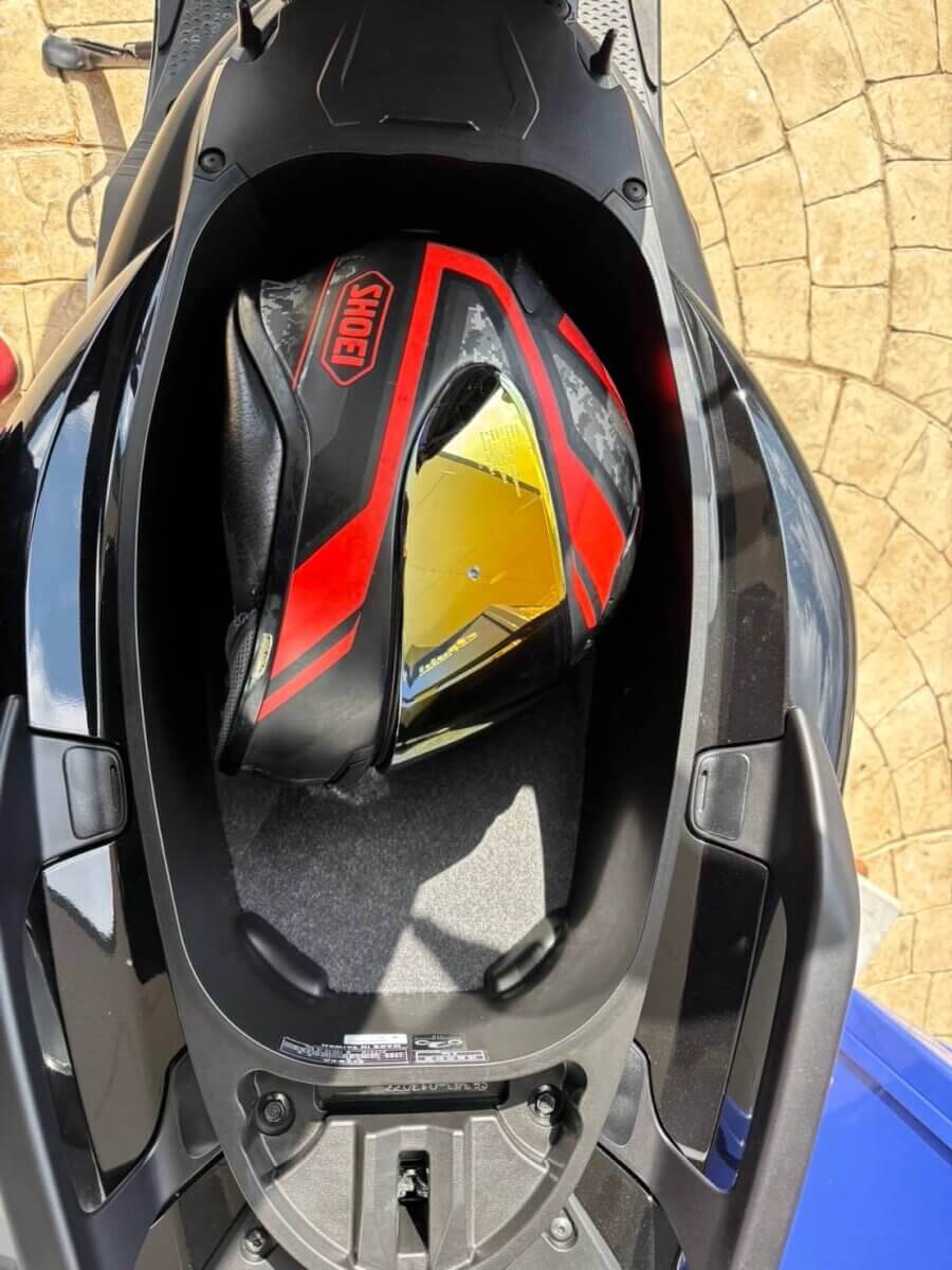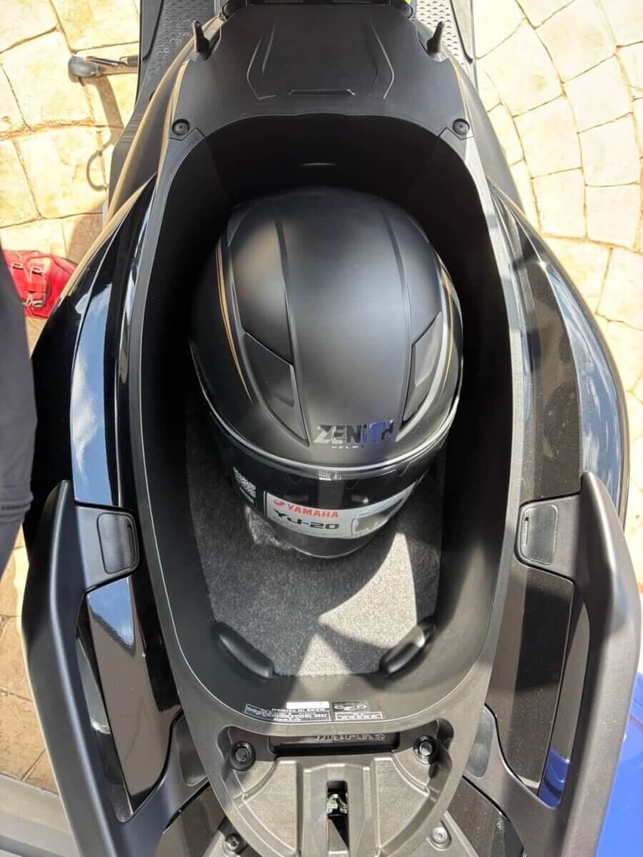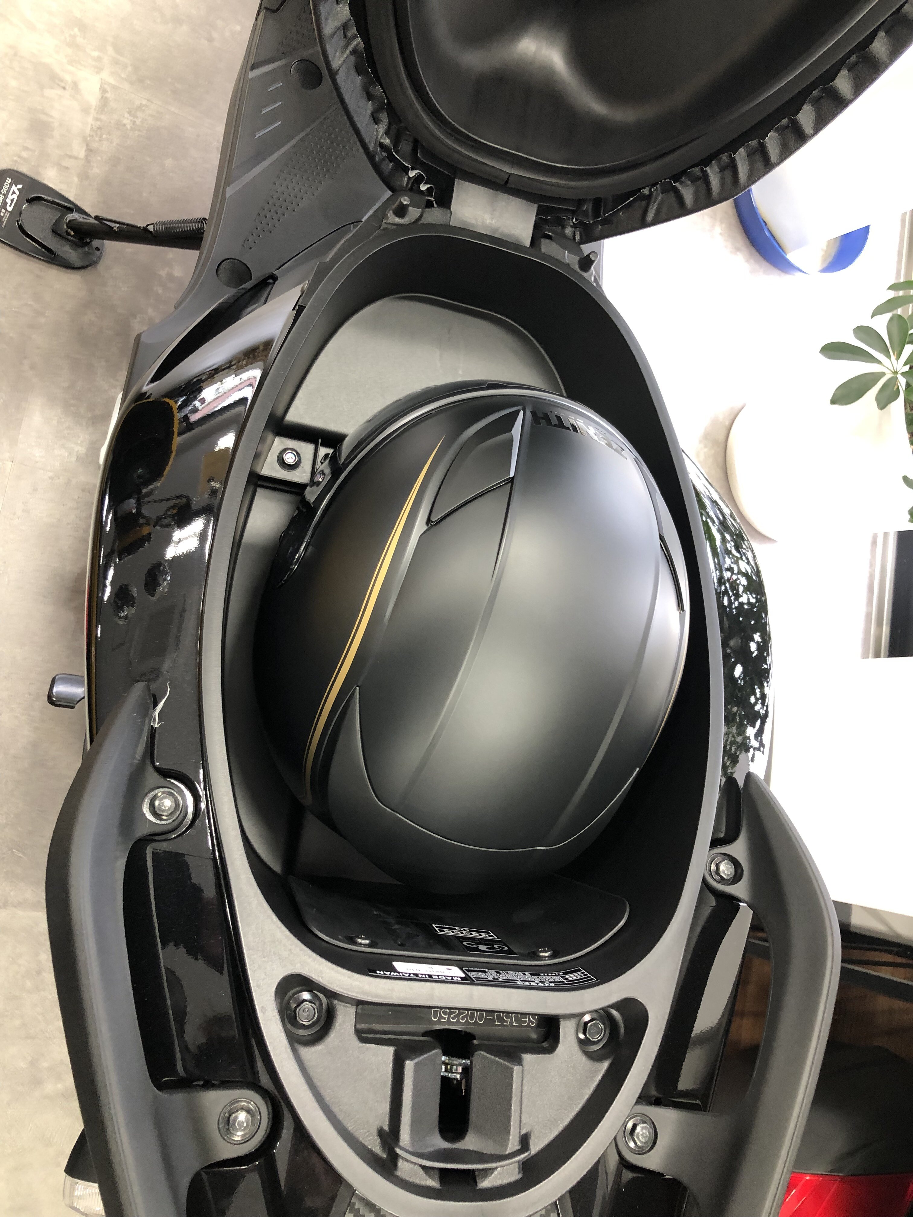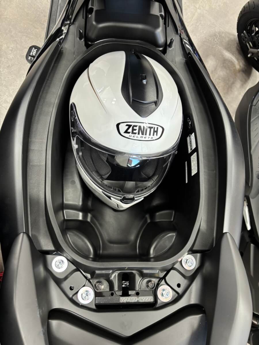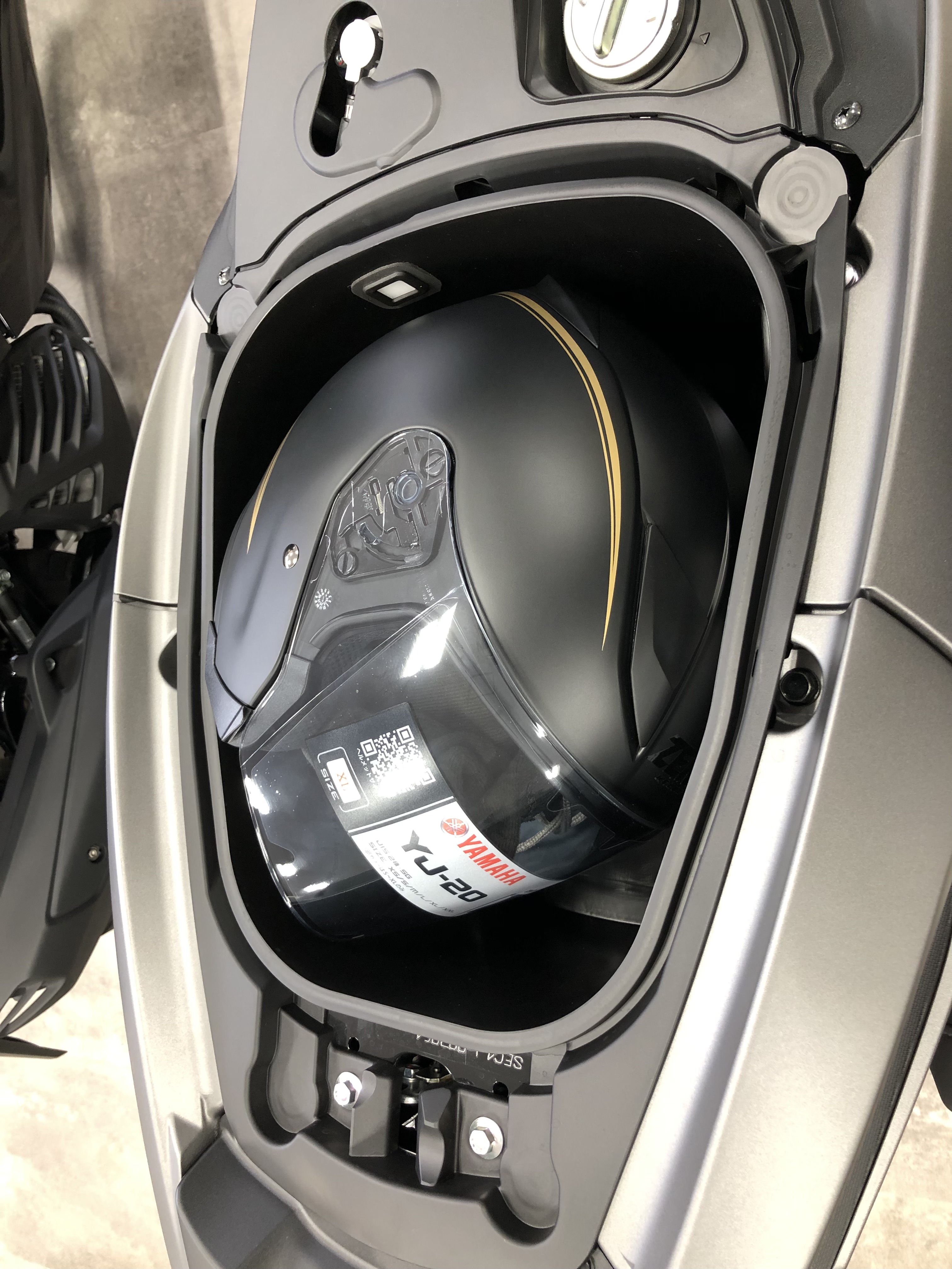 XMAXはシート下、中央部にヘルメットを入れる方向を示す絵がありますよ。