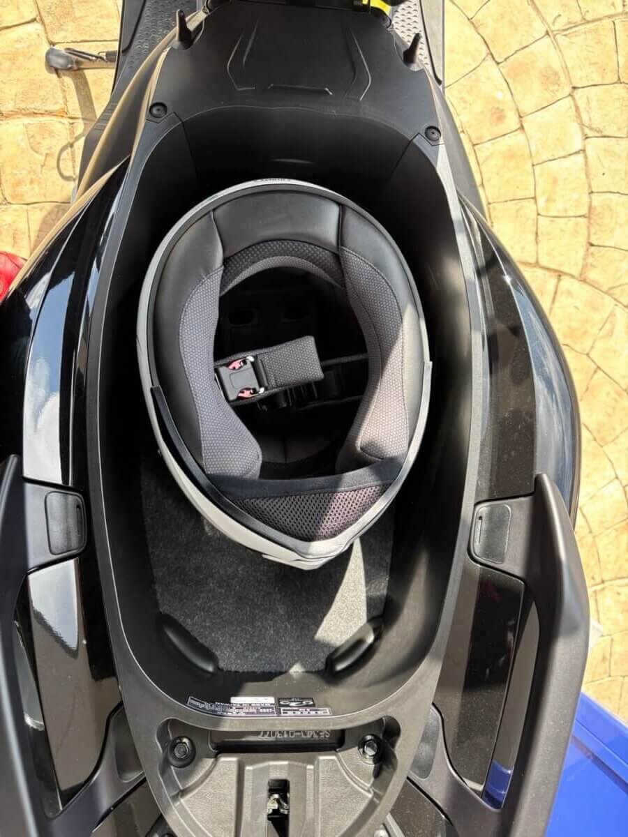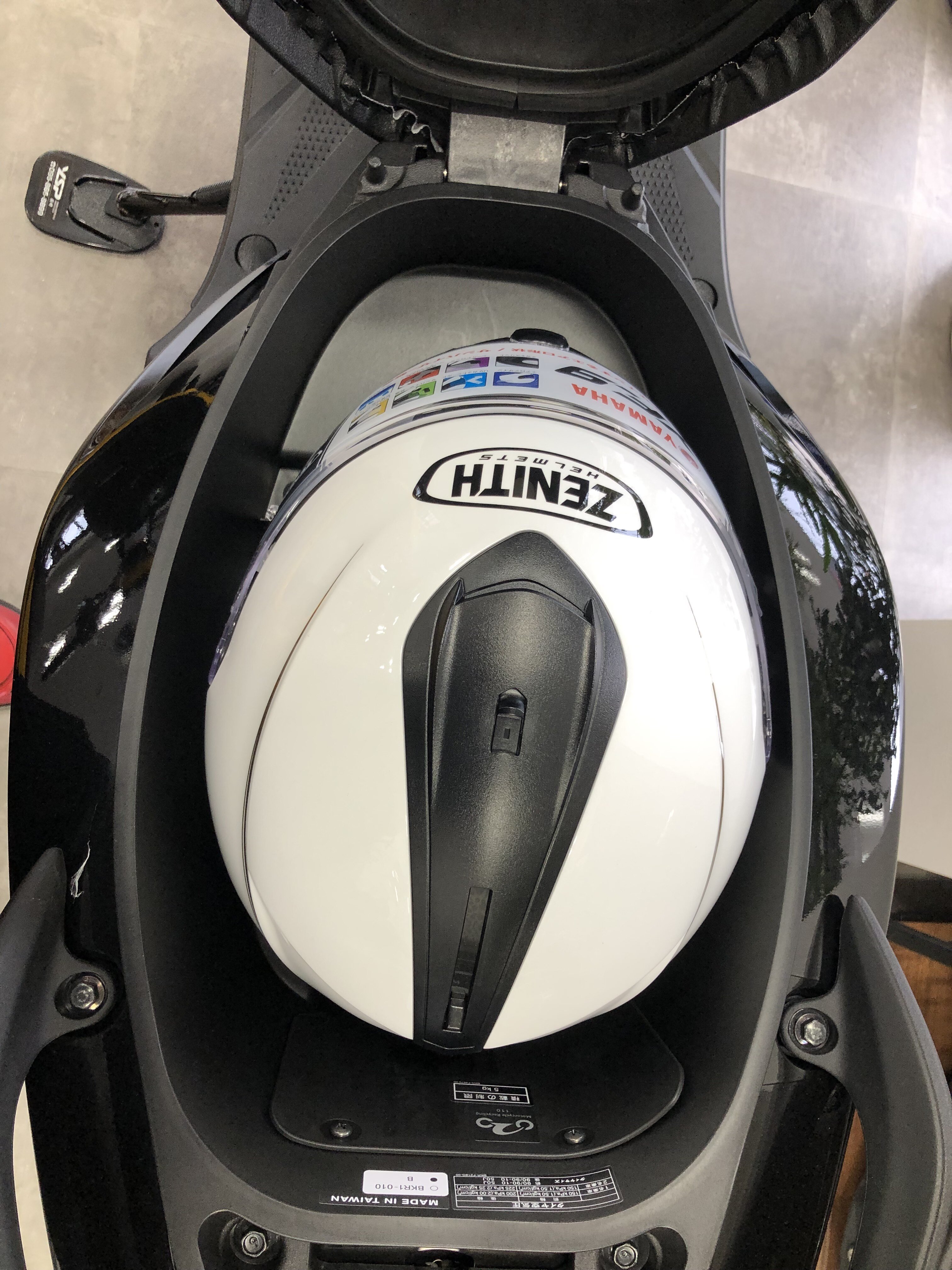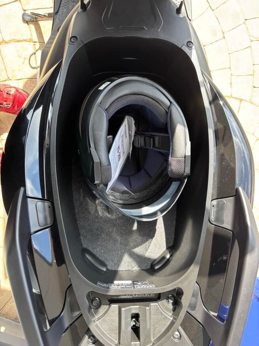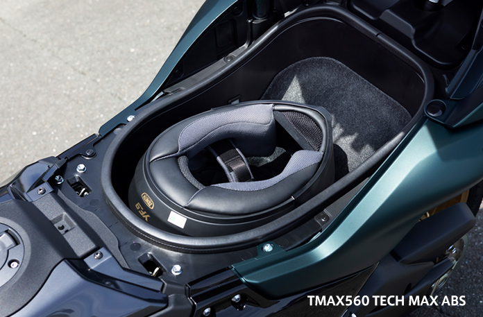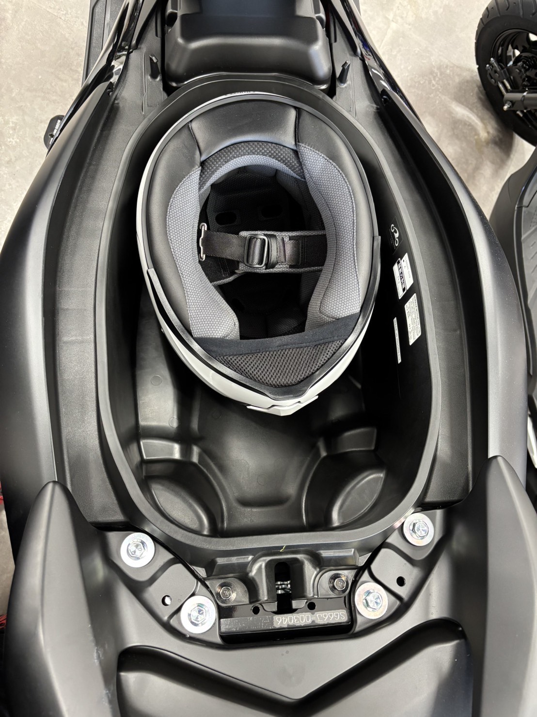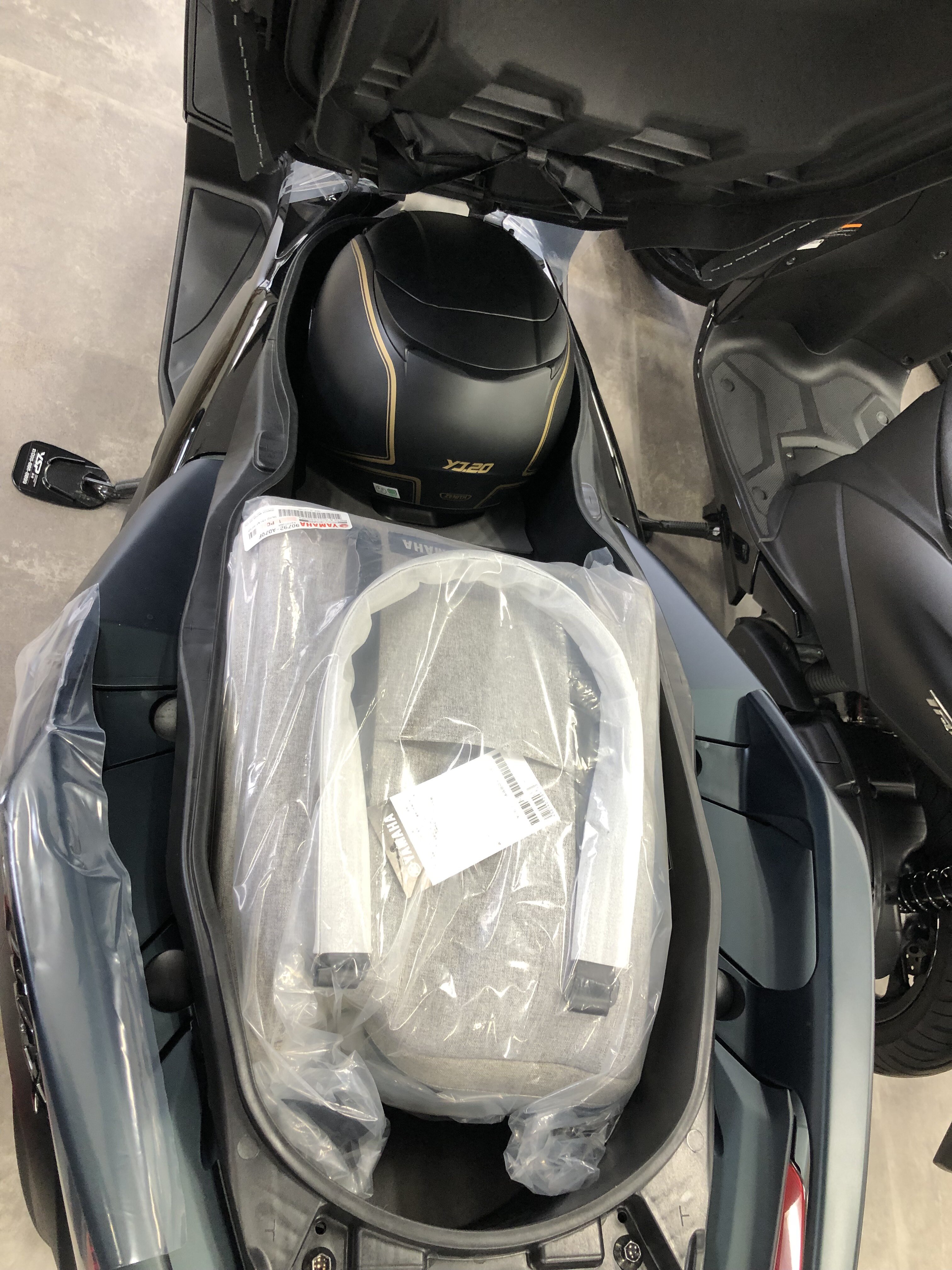 XMAXはシート下、中央部にヘルメットを入れる方向を示す絵がありますよ。