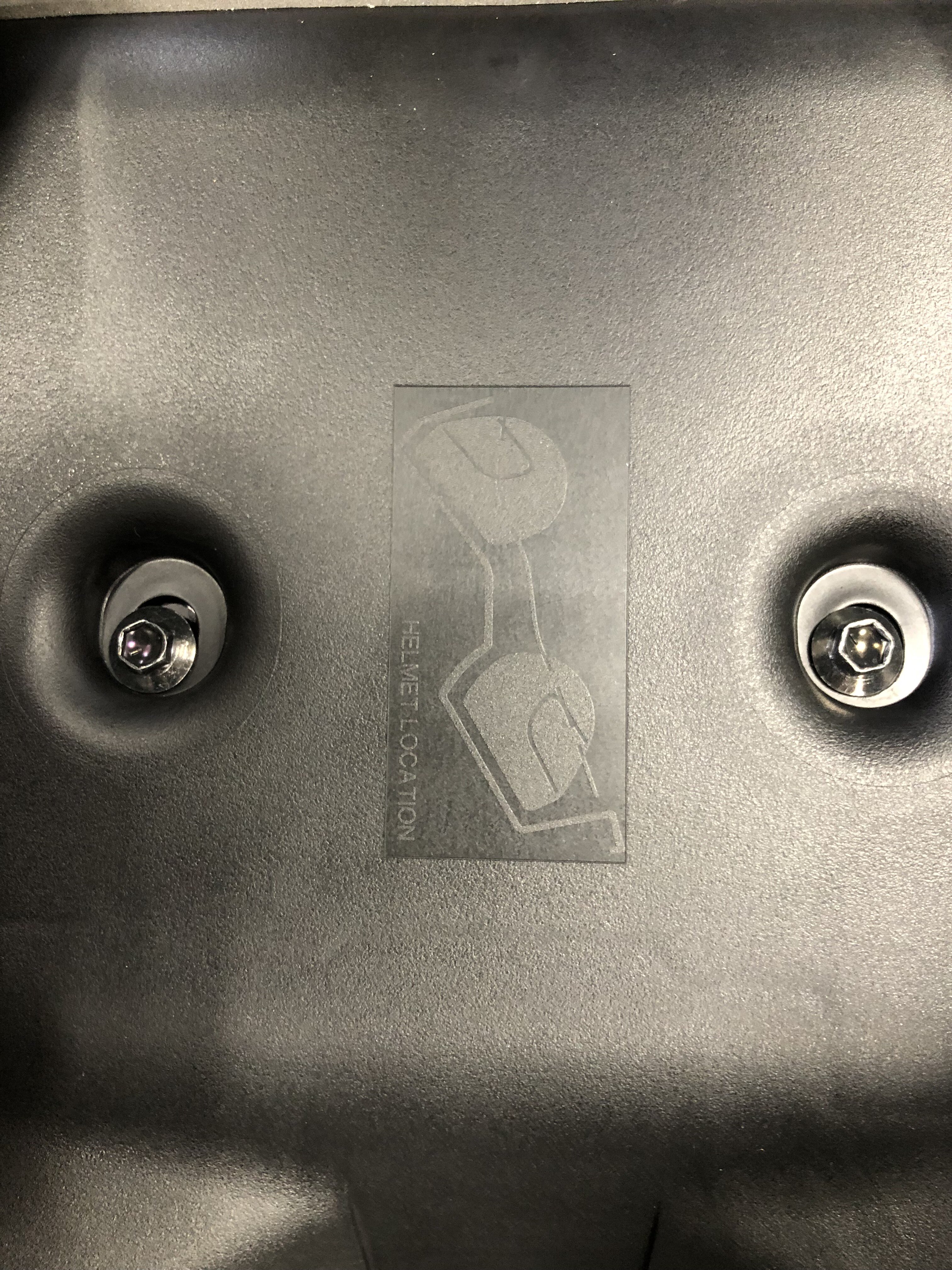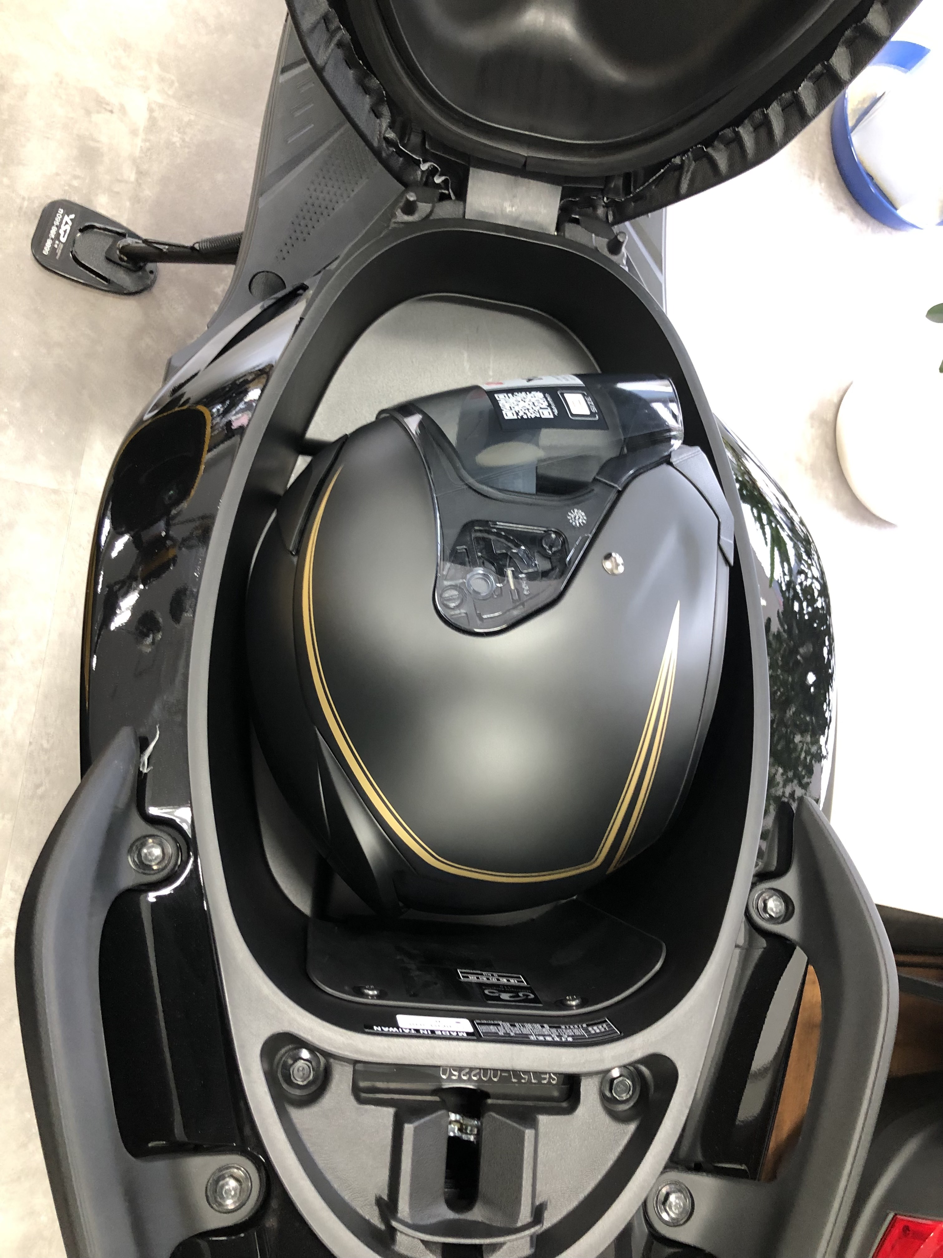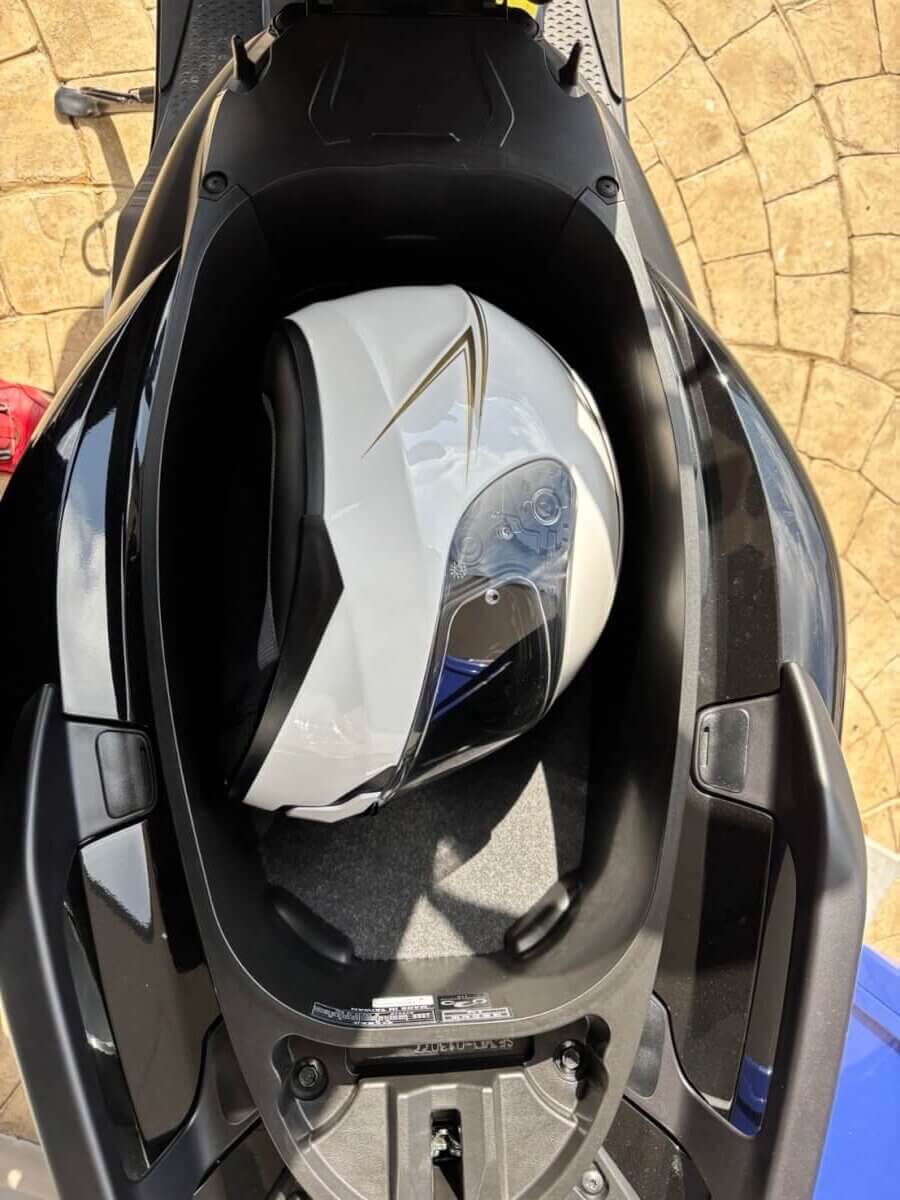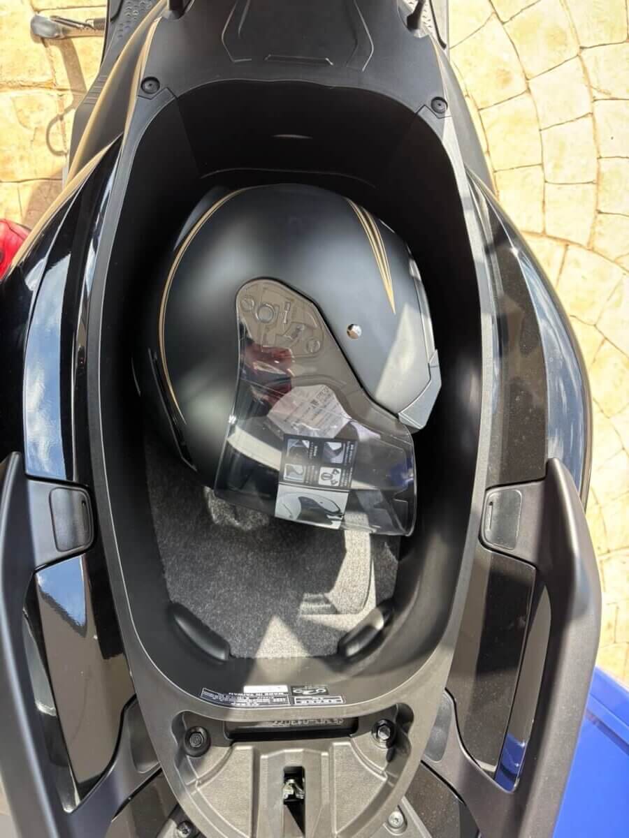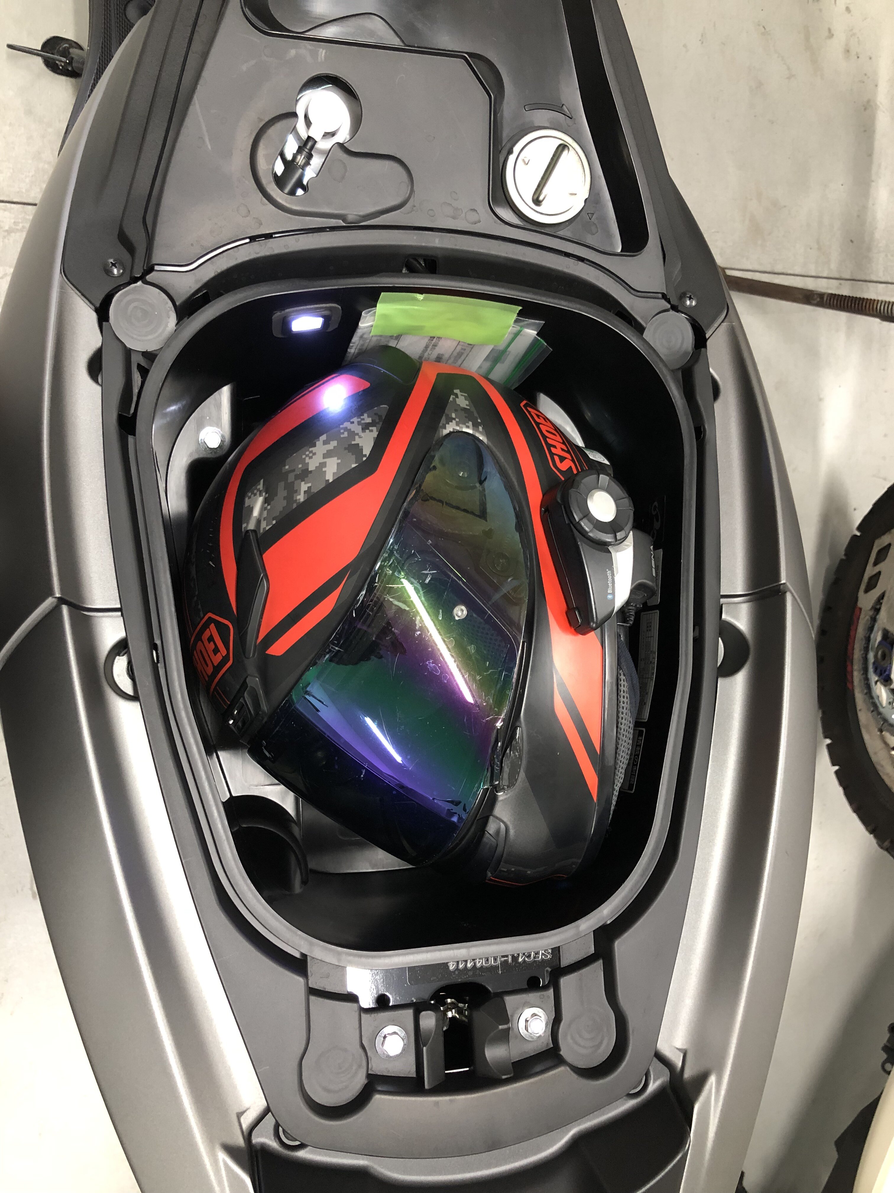 XMAXはシート下、中央部にヘルメットを入れる方向を示す絵がありますよ。
