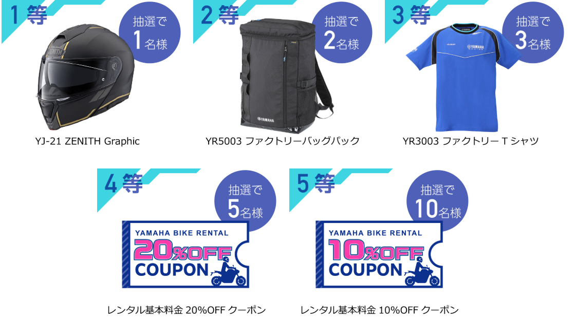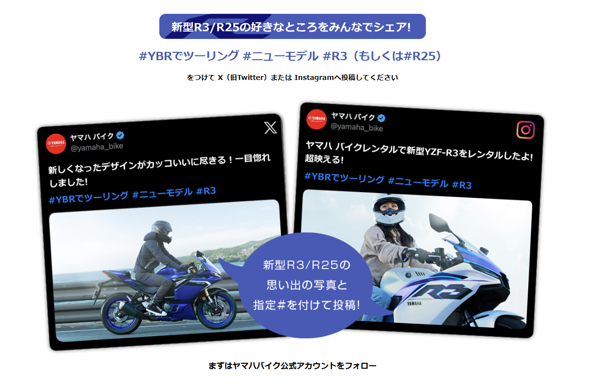ヤマハ バイクレンタルで新型YZF-R3/R25をレンタルして、「#YBRでツーリング #ニューモデル #R25 #R3」を付けて X もしくは Instagramに ツーリングの景色や想い出、新型YZF-R3/R25を写真付きで投稿いただいた中から抽選で豪華景品をプレゼント!