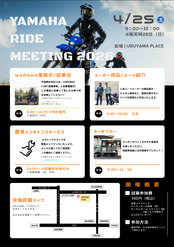 試乗ができるミーティングYAMAHA RIDE MEETING 2026が4月25日(土)に熊本で開催されます。 試乗をご希望の方はこちらのQRコードからご予約をお願いいたします。 試乗車は YZF-R9・YZF-R25・MT-09 Y-AMT・MT-07 Y-AMT XSR900GP・XSR900・XSR125・TRACER9GT+ Y-AMT WR125R・NMAX(変更あり) と豪華ラインナップとなっております。 イベントにつきましてはこちらから 熊本ヤマハInstagram YSP熊本イベントブログ
